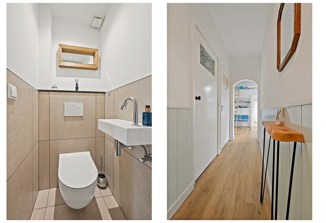 Het moderne toilet is voorzien van een fonteintje. Vanuit de gang is er toegang tot de diverse vertrekken.