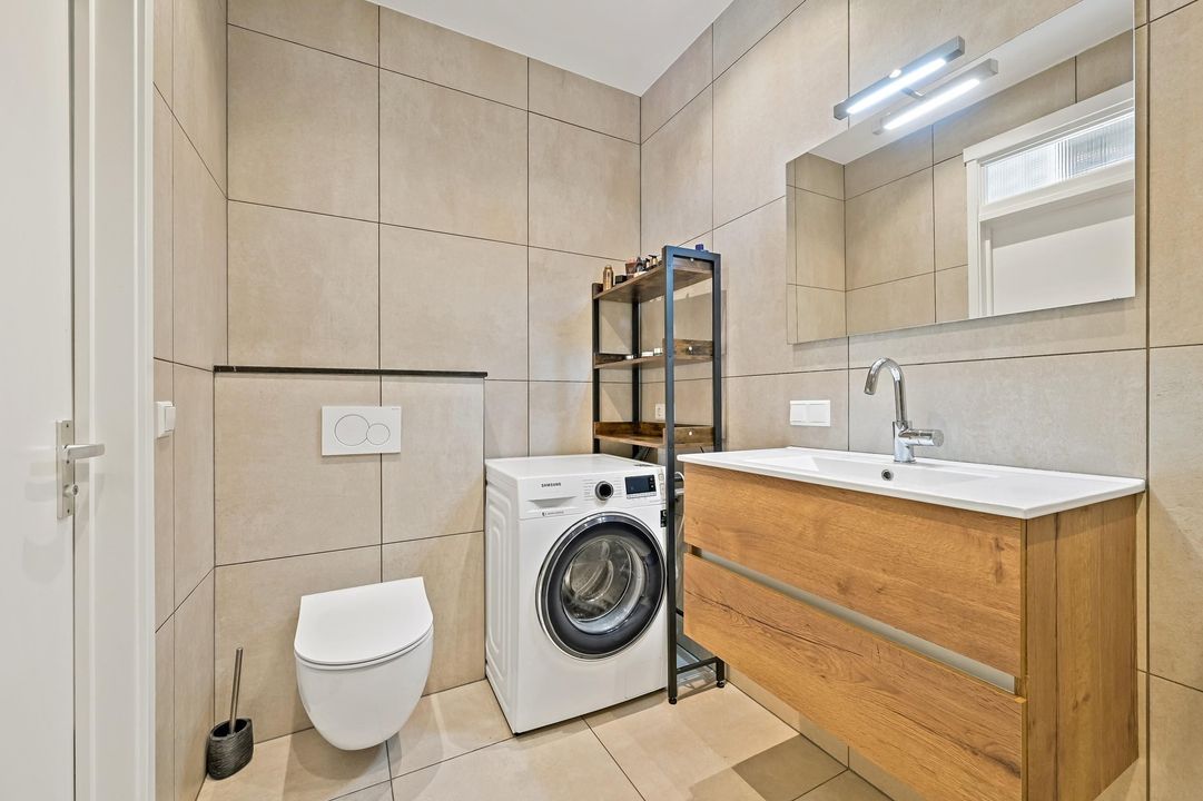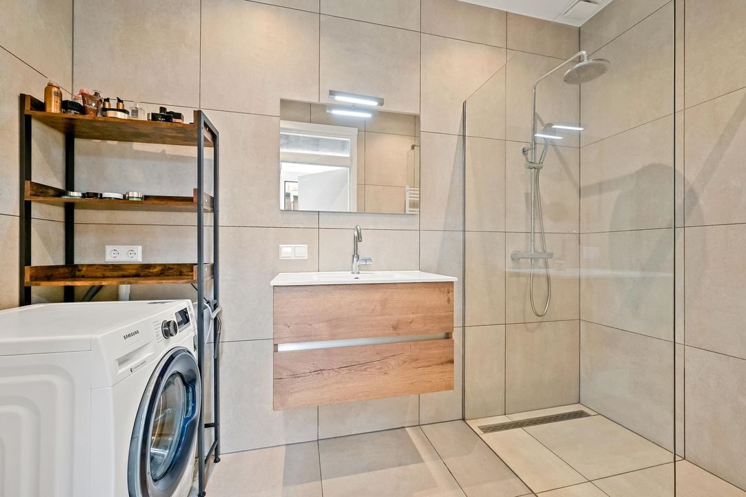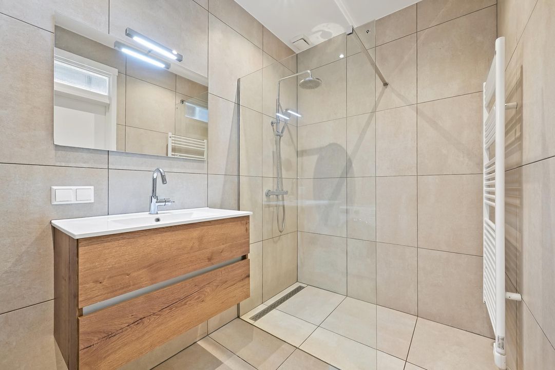 De moderne badkamer is fraaie gerenoveerd en voorzien van een inloopdouche, stijlvol wastafelmeubel, tweede toilet en aansluiting voor de wasmachine.
