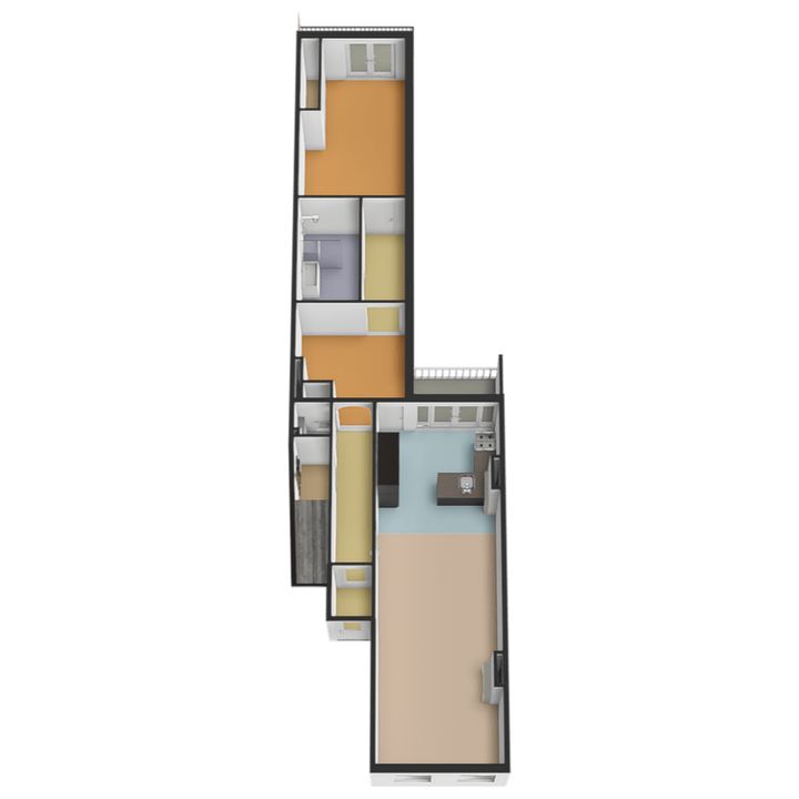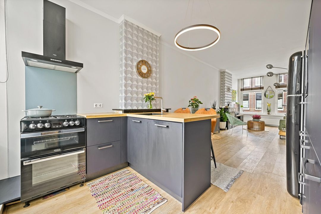 De keuken, uitgevoerd in een praktische wand- en L-opstelling, beschikt over een 4-pits gaskookplaat, vaatwasser en voldoende kastruimte. Vanuit de keuken stap je zo het eerste balkon op – perfect voor een kop koffie in de ochtendzon.