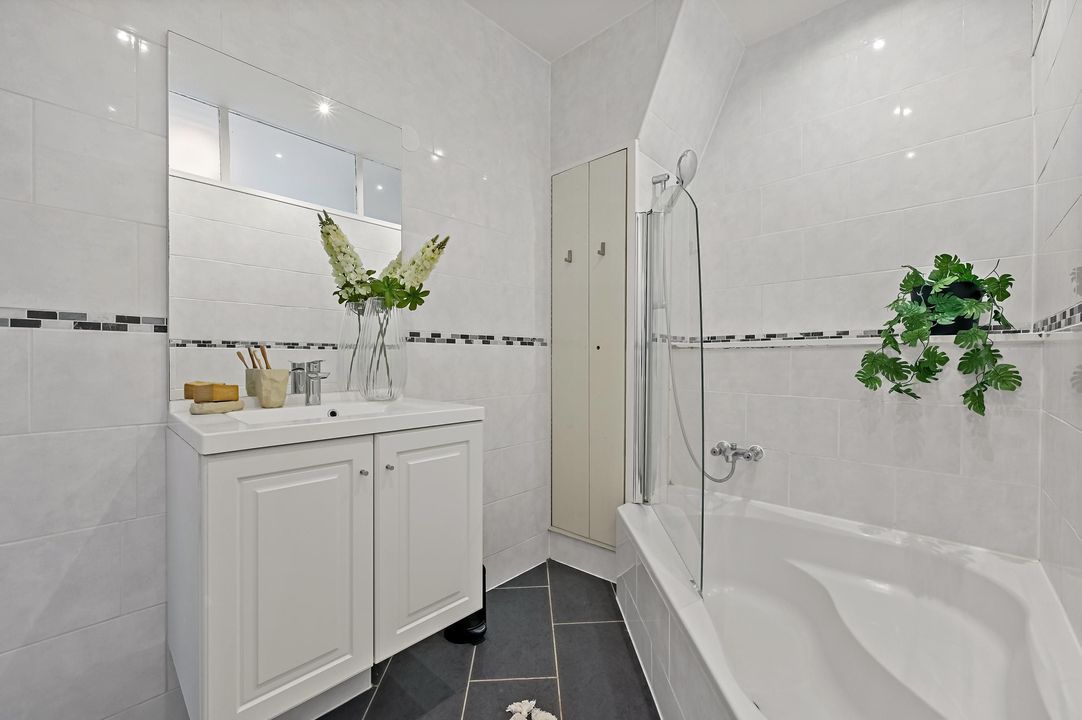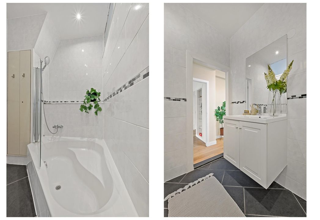 At the front of the apartment is the first bedroom, currently used as a walk-in closet and home office. The second bedroom is located at the rear and is used as the main bedroom. Centrally located within the apartment is the bathroom, which features a bathtub with shower, washbasin cabinet and designer radiator. The central heating system is also located in a fixed cupboard in the bathroom.