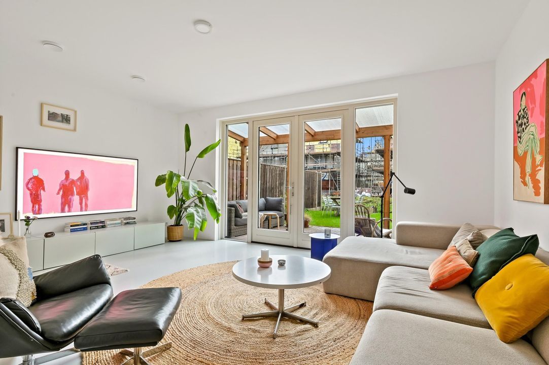 At the front is the modern open kitchen, which enjoys lots of natural light thanks to the corner position. The kitchen flows into the generous dining area – perfect for long dinners with family and friends. From here, you continue to the back of the house, where the living room is located. Large windows and French doors to the garden make this a wonderfully light space with a lovely view of the rear garden.