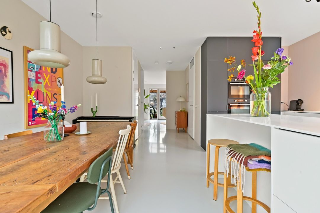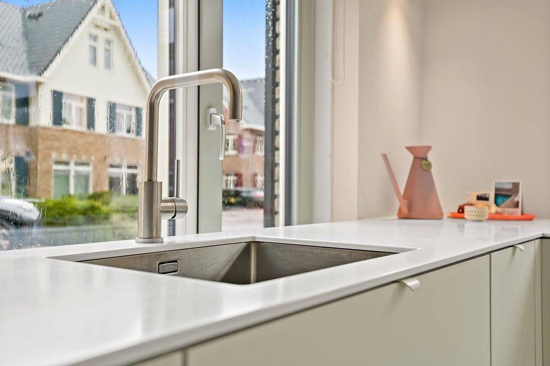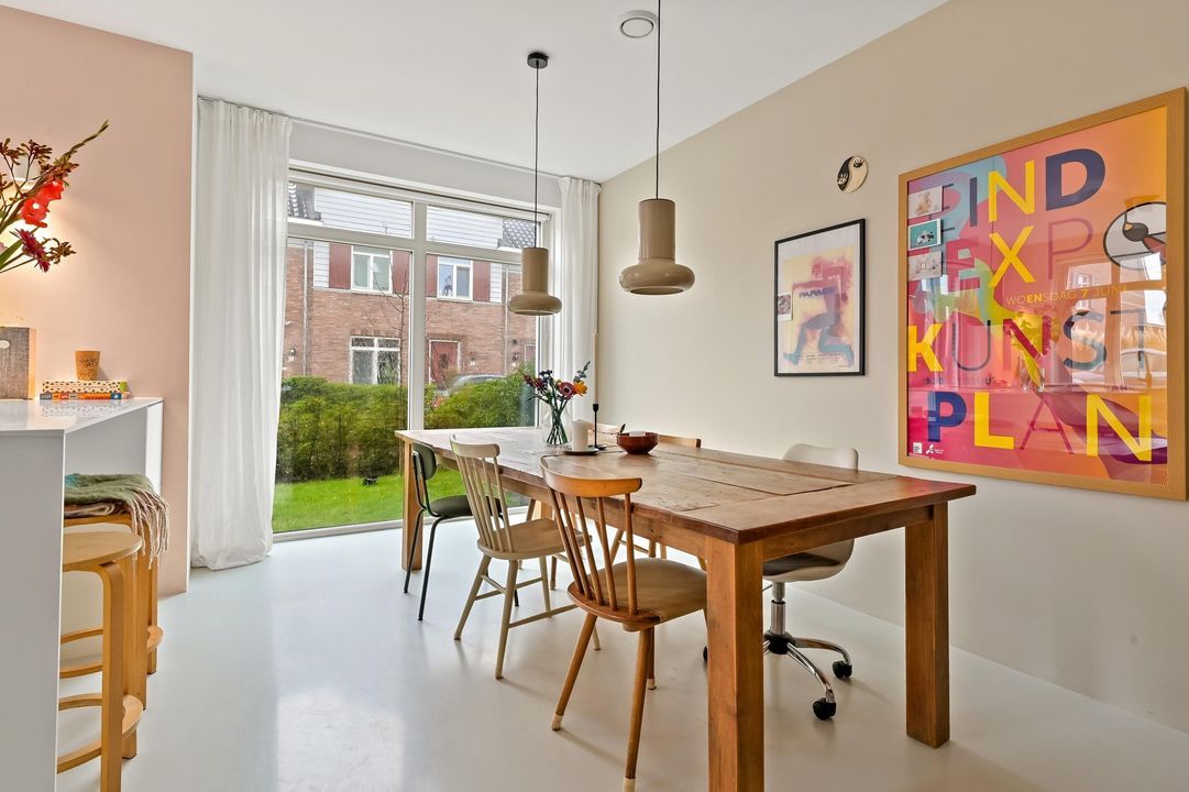 Via de ruime voortuin met eigen oprit en toegang tot de aangebouwde garage betreed je de woning. In de hal bevinden zich de meterkast en het moderne toilet met fontein. Vanuit de hal stap je in de lichte gang die de verschillende leefruimtes met elkaar verbindt. Aan de voorzijde ligt de moderne open keuken, voorzien van veel lichtinval vanwege de hoekligging. De keuken staat in directe verbinding met de ruime eetkamer, ideaal voor lange diners met familie en vrienden. Via de eetkamer loop je door de naar de achterzijde van de woning waar zich de woonkamer bevindt. Dankzij de grote raampartijen en openslaande deuren naar de tuin is dit een heerlijk lichte ruimte met een mooi uitzicht op de achtertuin.