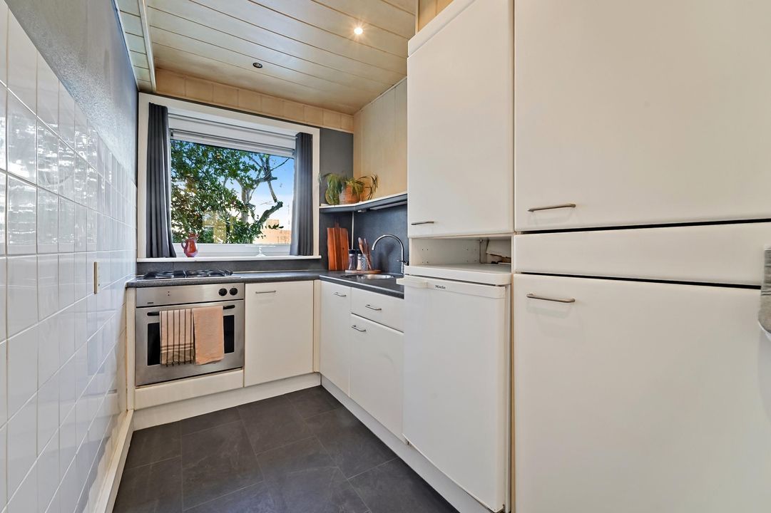Front garden with entrance to the enclosed communal porch with doorbell and mailbox panel. Upon entering the central hall, the apartment’s meter cupboard is located on the right-hand side. Entrance to the apartment, hallway with access to the kitchen, living/dining room en suite, bedroom, bathroom, separate toilet and storage cupboard. The kitchen is located at the front of the apartment, arranged in a corner layout and equipped with various built-in appliances. The central heating combi boiler is neatly concealed in a built-in cupboard in the kitchen. The generous living room extends over the full length of the apartment and is pleasantly bright due to large windows on both sides. The bedroom is situated at the rear of the apartment and is of good size. The lovely back garden can be accessed from both the dining area and the bedroom. Centrally located in the apartment is the bathroom, fitted with a shower and washbasin. Opposite the bathroom is the separate toilet.