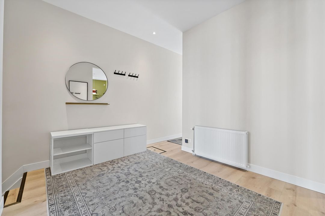 Upon entering through the spacious hallway/entrance, you are welcomed into a surprisingly bright and generous living/dining room featuring a sleek finished floor with a Fermacell insulated subfloor and high ceilings with atmospheric recessed lighting. The space feels open and modern, with ample room for both a cozy seating area and a large dining table.