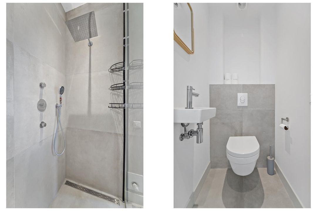 The apartment includes a modern toilet with washbasin and a stylish, high-end bathroom equipped with: