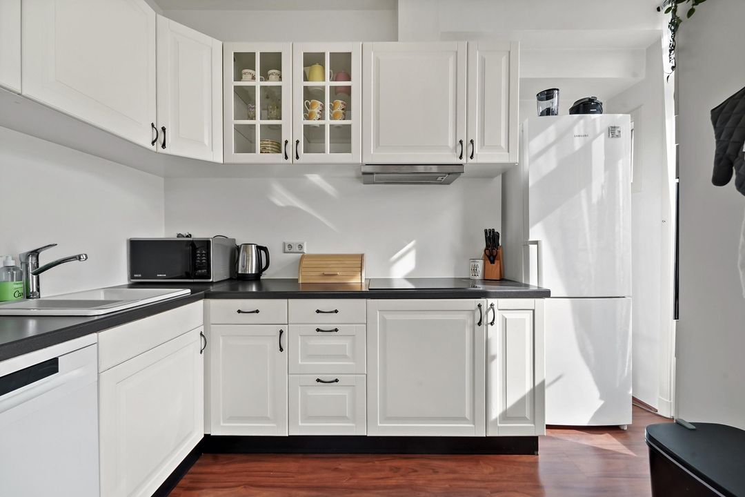 De keuken ligt centraal en praktisch, met directe toegang tot het balkon – hier pak je ’s ochtends je eerste koffie in de zon.