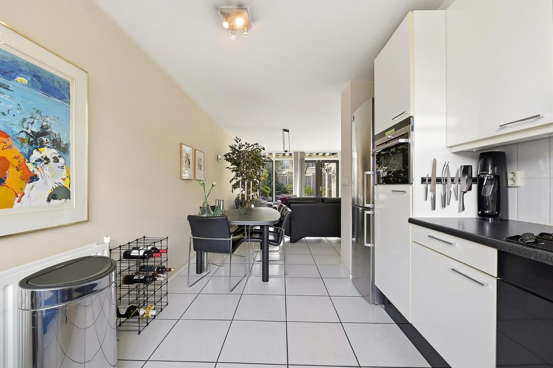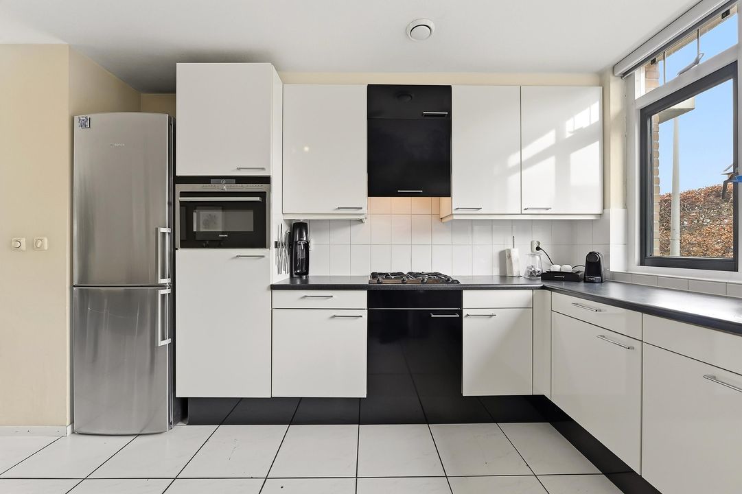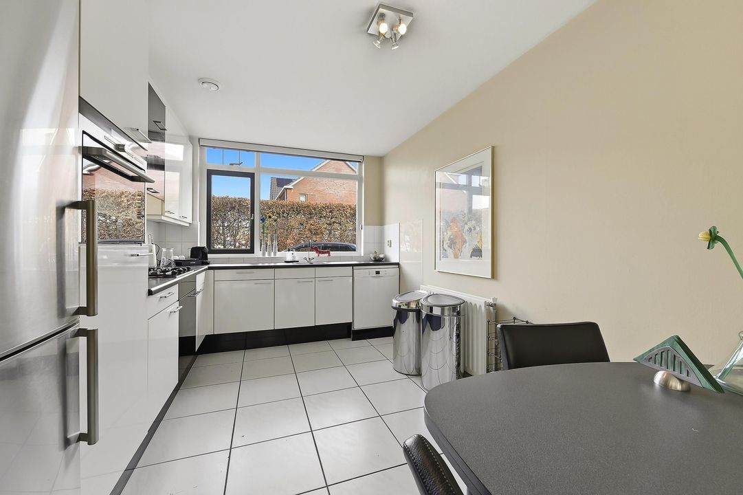 Aan de voorzijde bevindt zich de L-vormige keuken, praktisch opgesteld met veel werk- en kastruimte en prettig daglicht. De opstelling is functioneel en biedt mogelijkheden om naar eigen wens te moderniseren.
