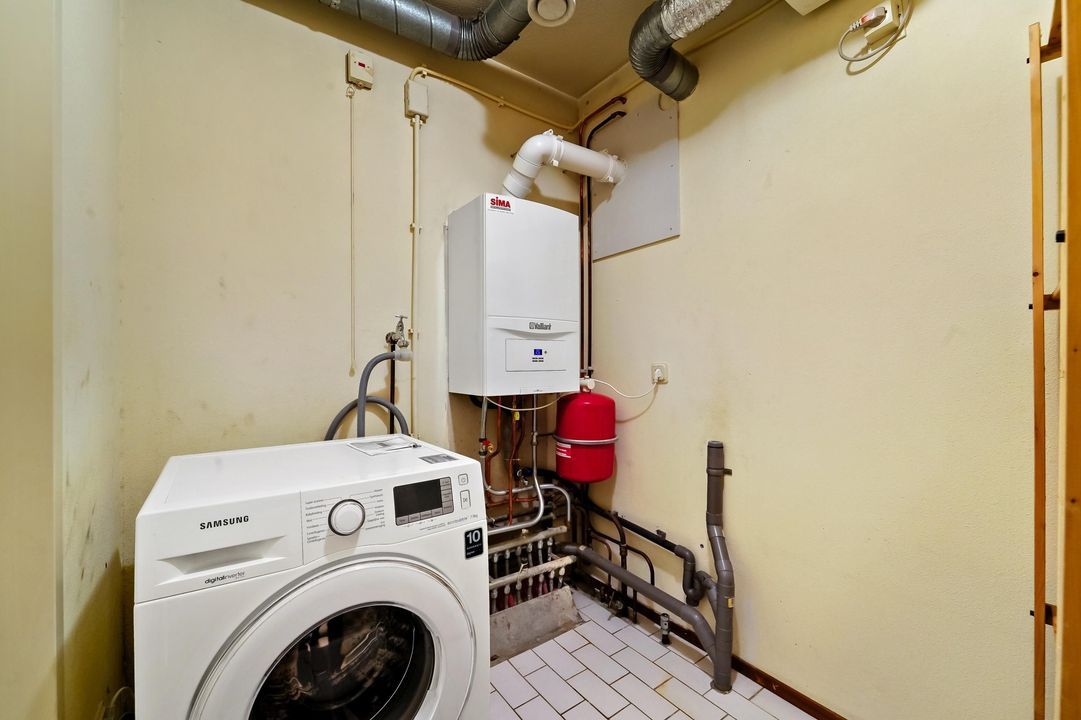 Entrance, spacious hallway providing access to all rooms. To the left of the hallway are two well-sized bedrooms. To the right you’ll find the separate toilet, bathroom, storage cupboard, and laundry room. At the end of the hallway you enter the generous living/dining room with open kitchen. The kitchen is designed in a corner layout and equipped with various built-in appliances. From the living room you can access the balcony, which measures no less than 15 m².