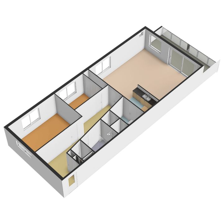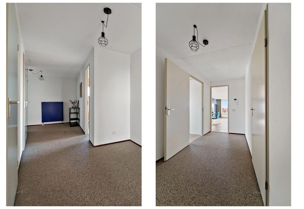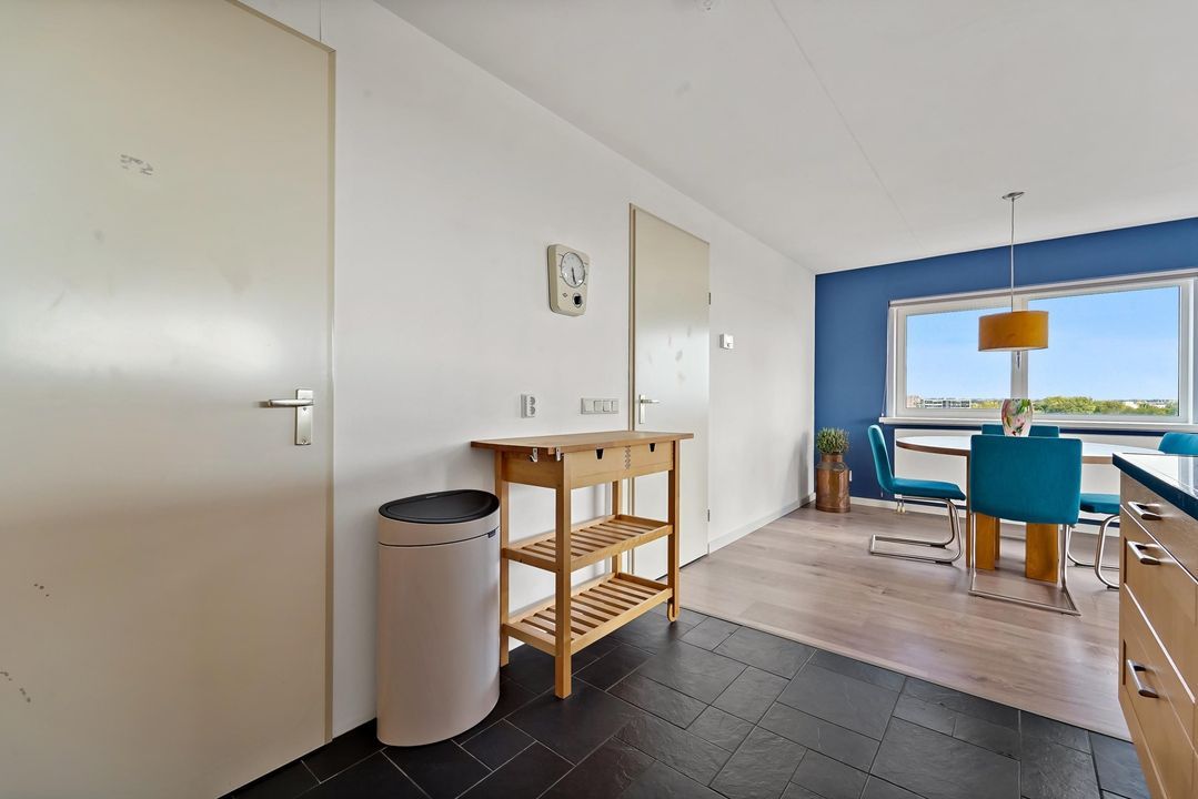 Entree woning, ruime entreehal met toegang tot ieder vertrek. Aan de linkerzijde van de hal bevinden zich twee slaapkamers welke beide van goed formaat zijn. Aan de rechterzijde van de hal vindt u het separaat toilet, badkamer, provisiekast en de wasruimte. Aan het eind van de hal vindt u de royale woon-/eetkamer met open keuken. De keuken is uitgevoerd in hoekopstelling en voorzien van diverse inbouwapparatuur. Vanuit de woonkamer bereikt u het balkon met een oppervlakte van maar liefst 15 m².