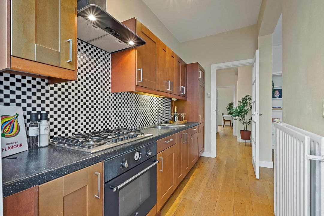 Overloop met toegang tot alle vertrekken. Over de volle lengte van de woning strekt zich de ruime en lichte woon-/eetkamer-en-suite. Dankzij de ligging aan de voorzijde geniet je hier van een vrij uitzicht over een groenvoorziening, wat zorgt voor extra privacy en een prettige lichtinval. Vanuit de eetkamer is de open keuken bereikbaar, uitgevoerd in een praktische opstelling en voorzien van diverse inbouwapparatuur. Vanuit de keuken is er toegang tot het balkon. Aan de voorzijde van het appartement vindt u de eerste slaapkamer welke thans in gebruik is als inloopkast en werkkamer. De tweede slaapkamer vind je aan de achterzijde en is in gebruik als slaapkamer. Centraal in de woning bevindt zich de badkamer welke beschikt over een ligbad met douche, wastafelmeubel en designradiator. In de badkamer is tevens de C.V.-opstelling gesitueerd in een vaste kast.
