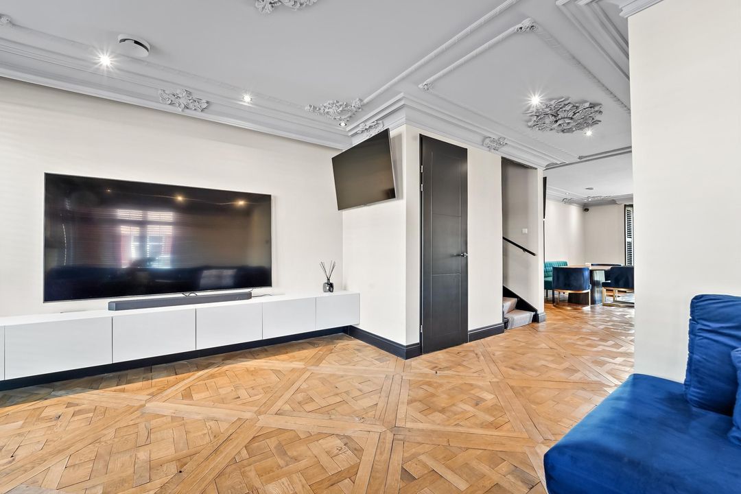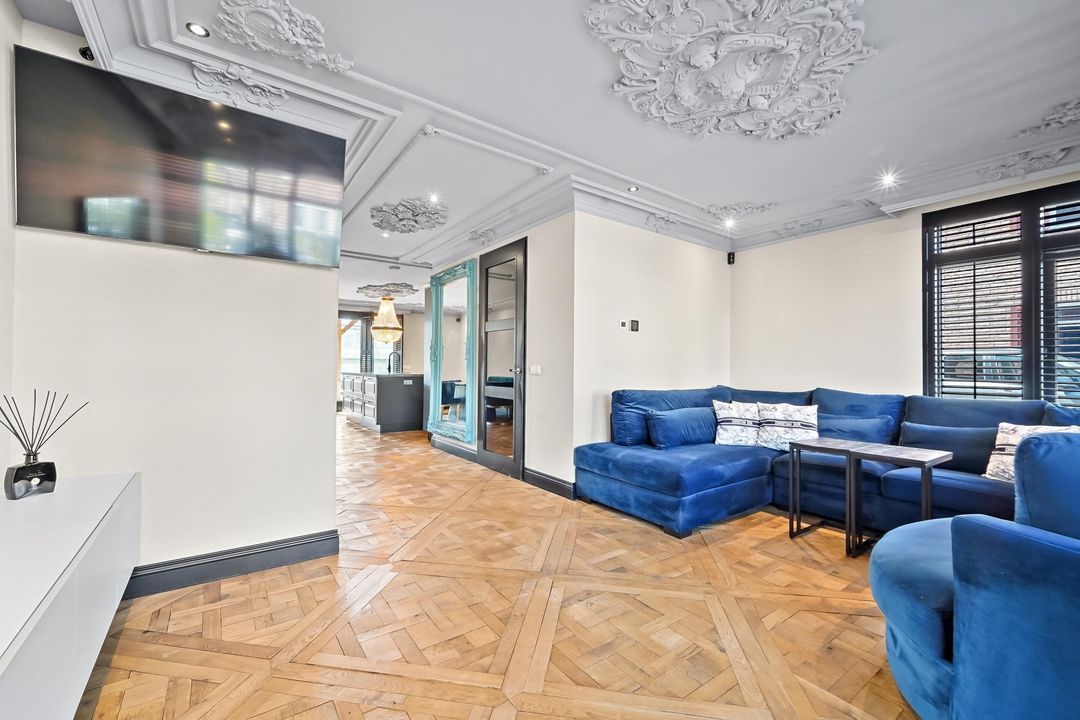 From the hall, you enter a corridor connecting the various living areas. At the front of the house is the generous living room, filled with natural light thanks to its corner position and finished with a beautiful wooden floor.