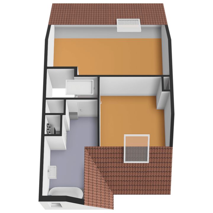 De badkamer bevindt zich aan de voorzijde en is uitgerust met een ligbad, wastafelmeubel en de wasmachineaansluiting.