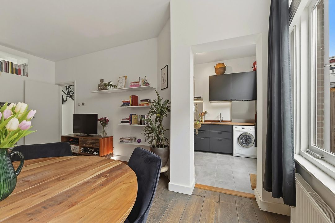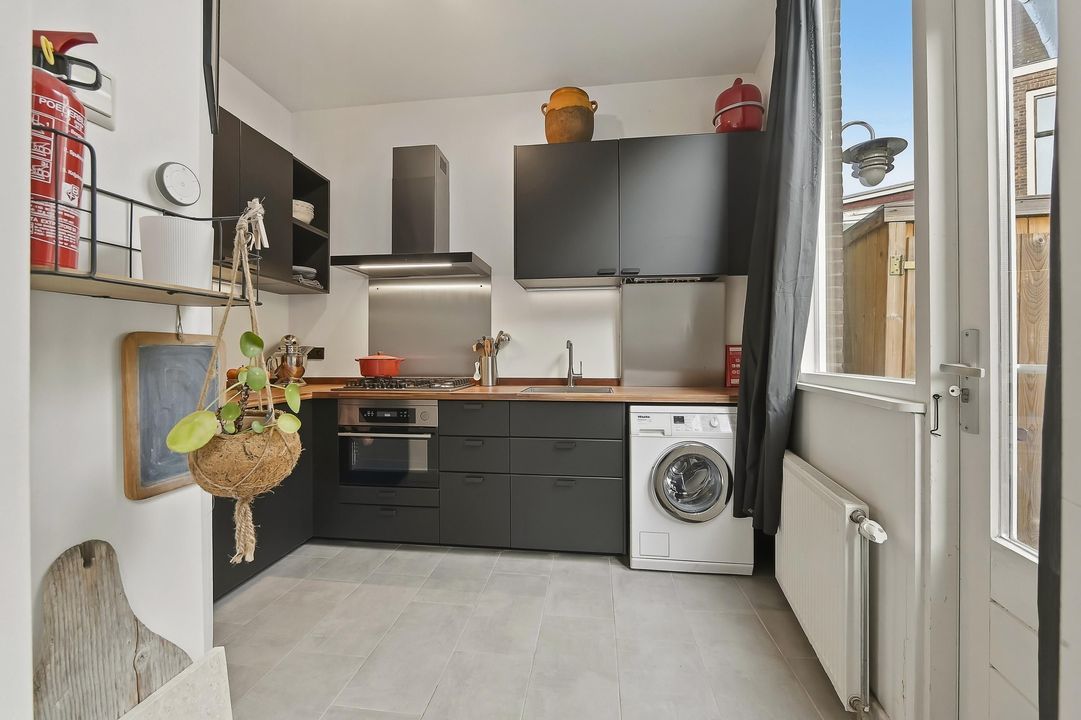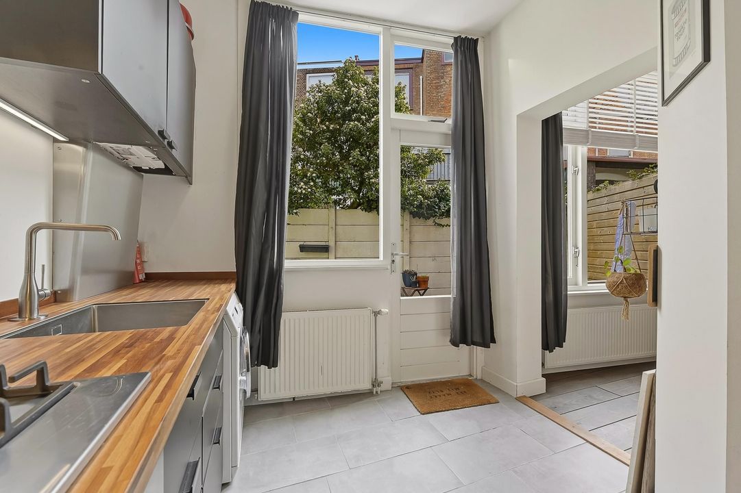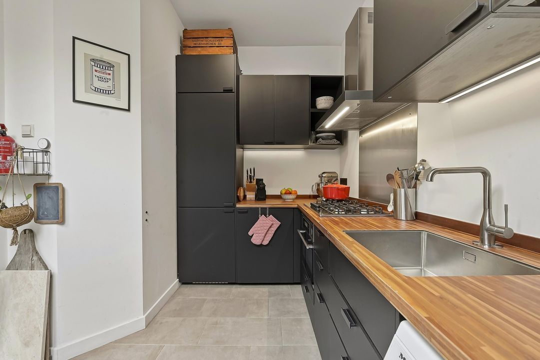 De keuken bevindt zich eveneens aan de achterzijde, in directe verbinding met de woonkamer. De moderne keuken is voorzien van inbouwapparatuur en een fraai houten werkblad met voldoende werk- en bergruimte.