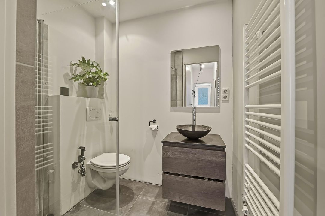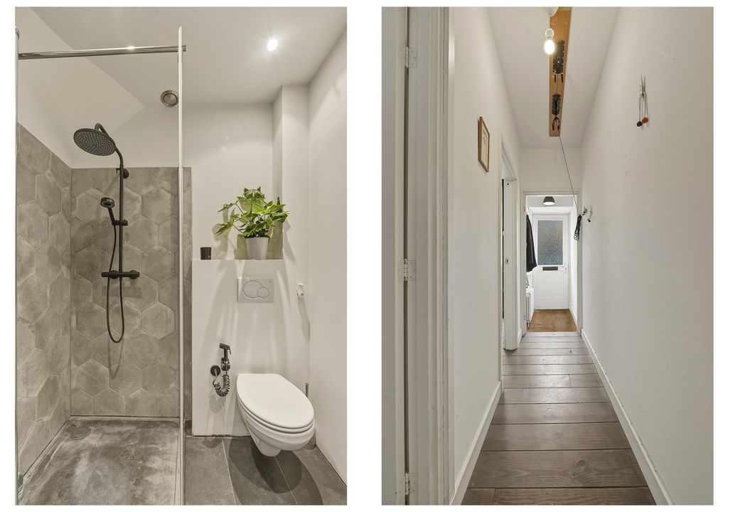 Verderop in de gang vind je de moderne badkamer. Deze is compact maar slim ingedeeld en voorzien van een douche, wastafelmeubel en toilet. De afwerking is strak en eigentijds, waardoor de ruimte een frisse en verzorgde uitstraling heeft.