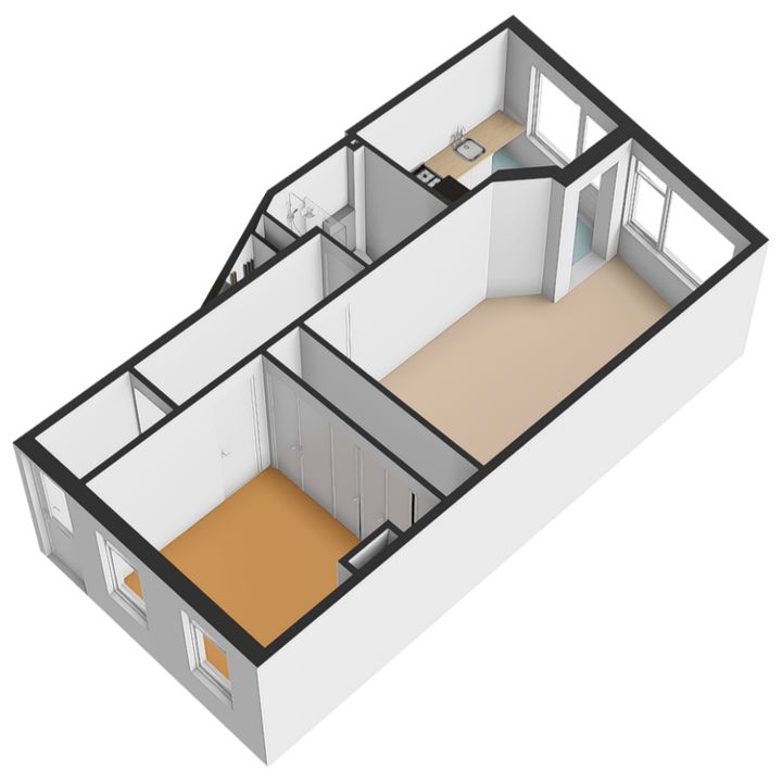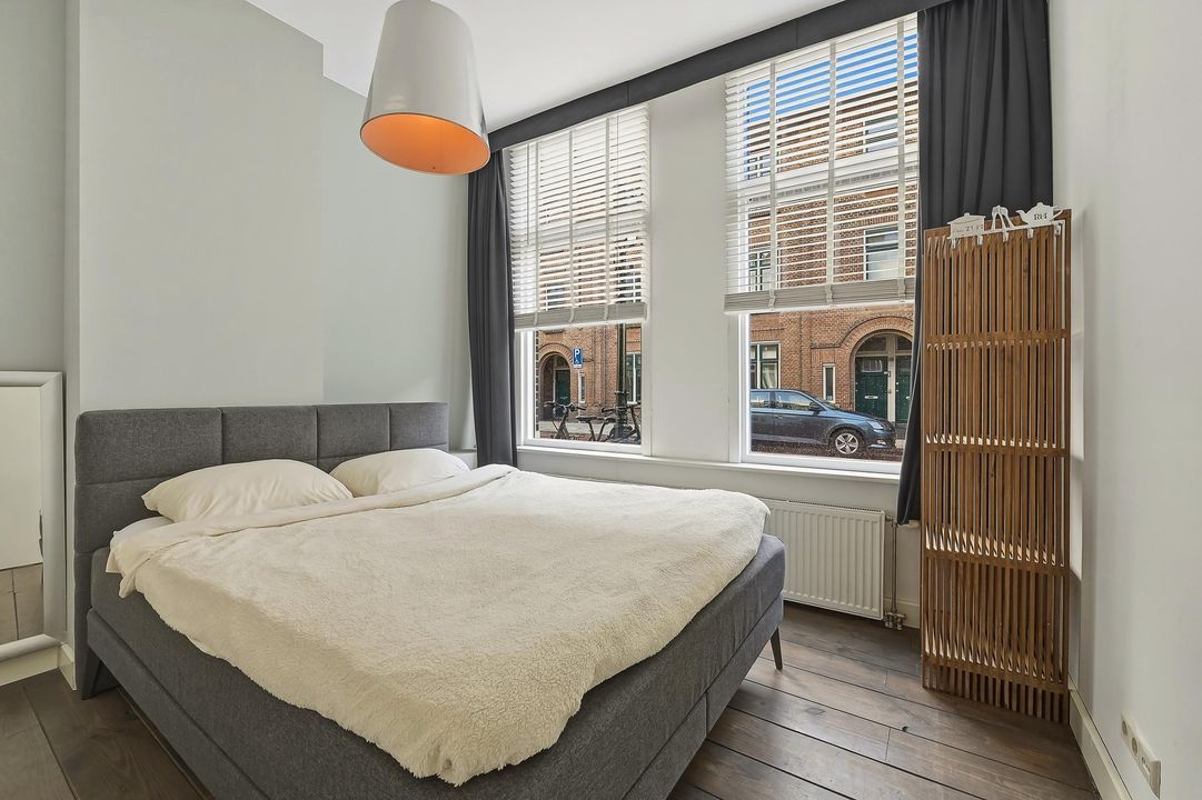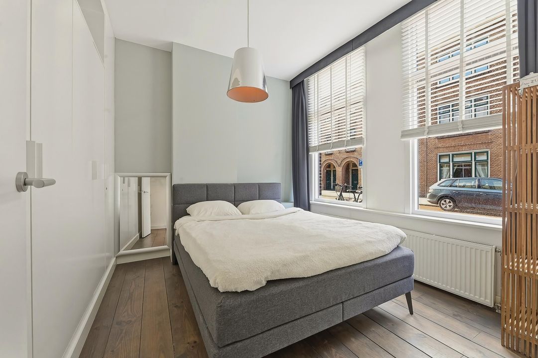 Aan de voorzijde van de woning bevindt zich de slaapkamer. Deze kamer ligt rustig aan de straatkant en biedt voldoende ruimte voor een tweepersoonsbed en een kledingkast.