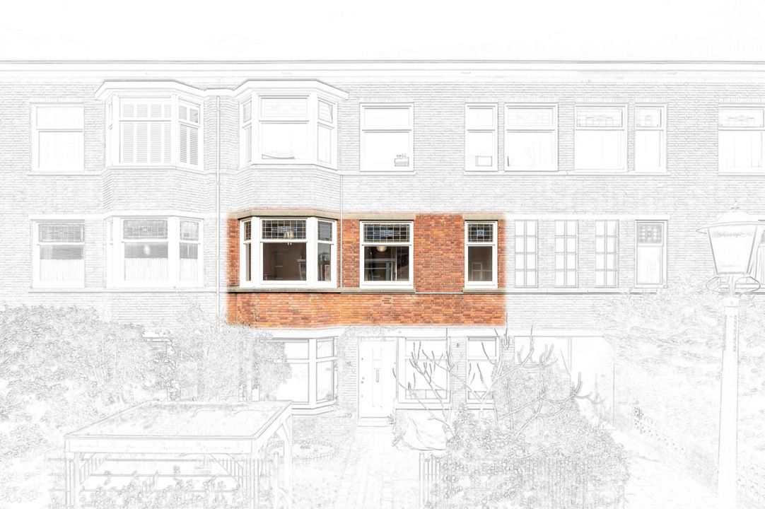 Aan de voorzijde bevindt zich de lichte woonkamer met een karakteristieke erker, wat zorgt voor extra ruimte en veel daglicht. De woonkamer staat in verbinding met de eetkamer aan de achterzijde via een charmante kamer-en-suite separatie met vaste kasten, wat zorgt voor een klassieke indeling en de mogelijkheid om de ruimtes van elkaar af te sluiten. De eetkamer biedt voldoende ruimte voor een grote eettafel en ligt direct naast de keuken.