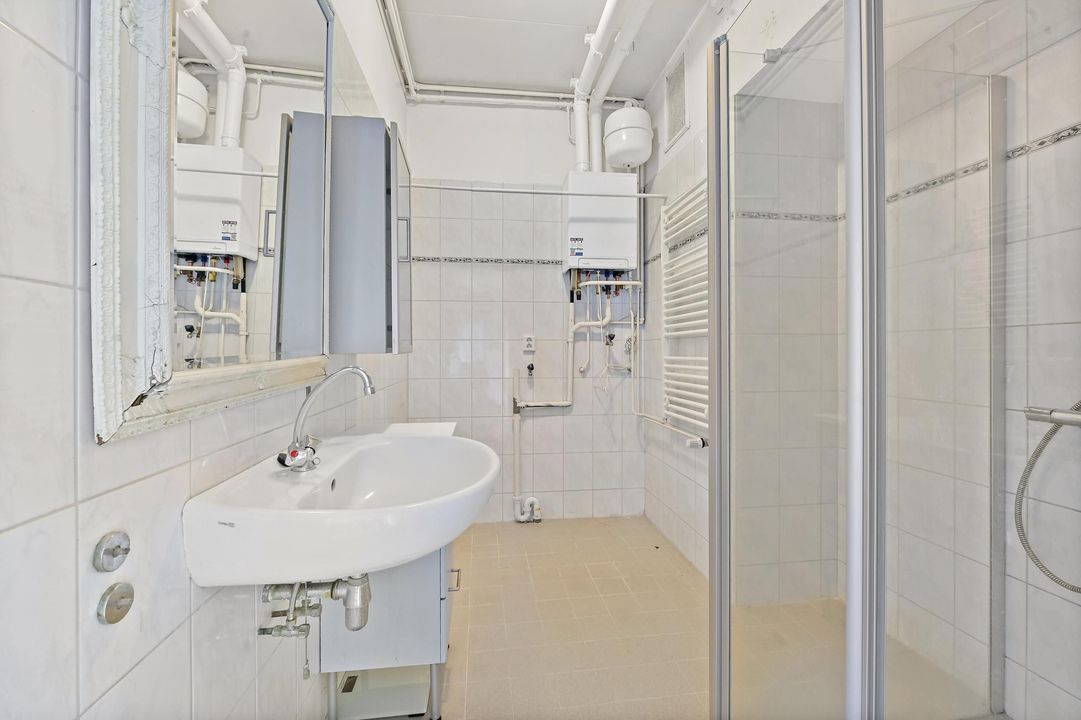 De badkamer is voorzien van een douche en wastafel. Daarnaast is er een separaat toilet bereikbaar vanuit de hal.