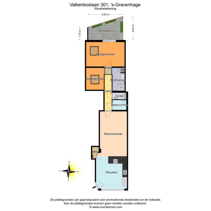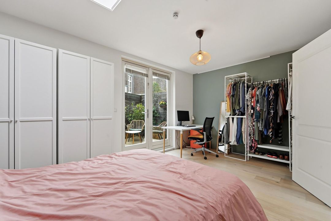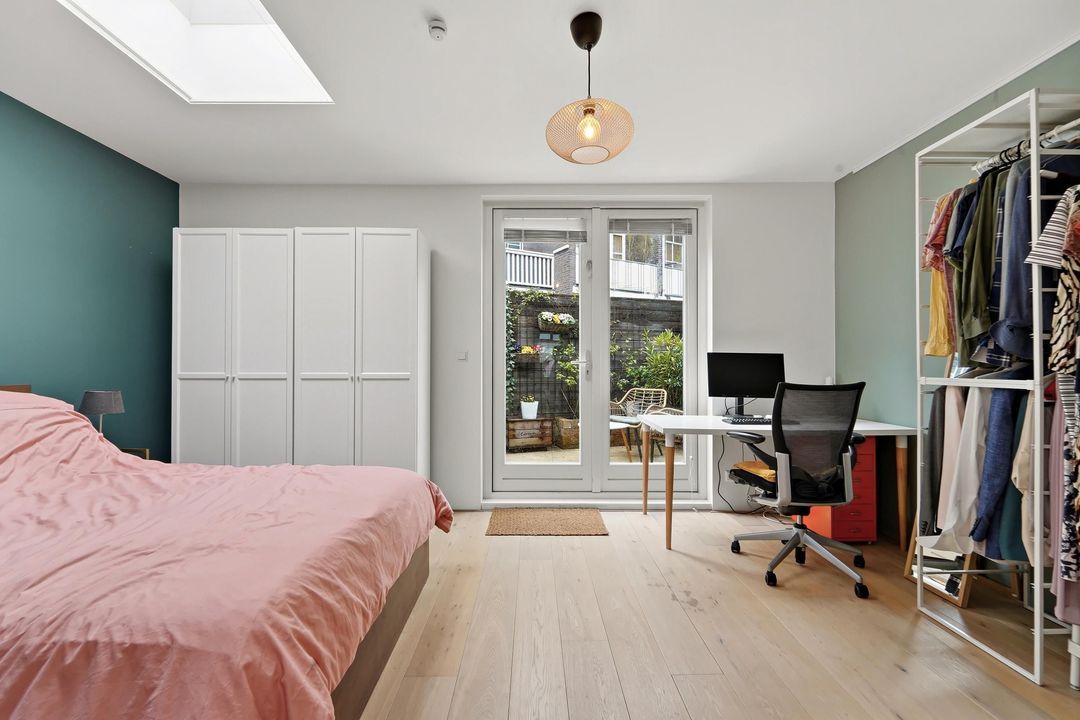 Entrance at street level, front door; meter cupboard (8 circuits with residual-current device); living/dining room with open kitchen fitted with various built-in SMEG appliances, including a 4-burner gas hob with extractor, dishwasher, and fridge-freezer combination; connecting hallway with storage space and washing machine connection; separate toilet with concealed cistern; bathroom with walk-in shower, washbasin unit, mechanical ventilation, and neatly concealed central heating boiler (Remeha, 2018); bedroom I with skylight; bedroom II with access—through French doors—to the west-facing rear garden with wooden storage.