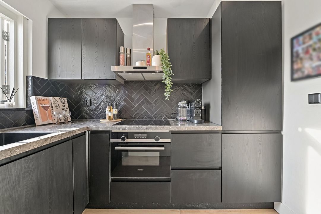 Overloop met separaat toilet en toegang tot de keuken en woonkamer. De keuken is gelegen aan de achterzijde van de woning, is in een hoekopstelling uitgevoerd en voorzien van een fraai marmeren aanrechtblad. De keuken is in 2020 aangebracht en volledig voorzien van Siemens inbouwapparatuur (Koel-/vriescombinatie, combi-oven, inductiekookplaat, rvs afzuigkap, vaatwasmachine en Quooker). De woonkamer is in een L-vorm en van goed formaat. Door de open indeling en de grote erker geniet je hier van veel lichtinval en gevoel van ruimte. Vanuit de woonkamer bereik je via de schuifpui het terras aan de achterzijde welke is gelegen op het zonnige zuidwesten (middag- en avondzon). Open trap naar de tweede verdieping.
