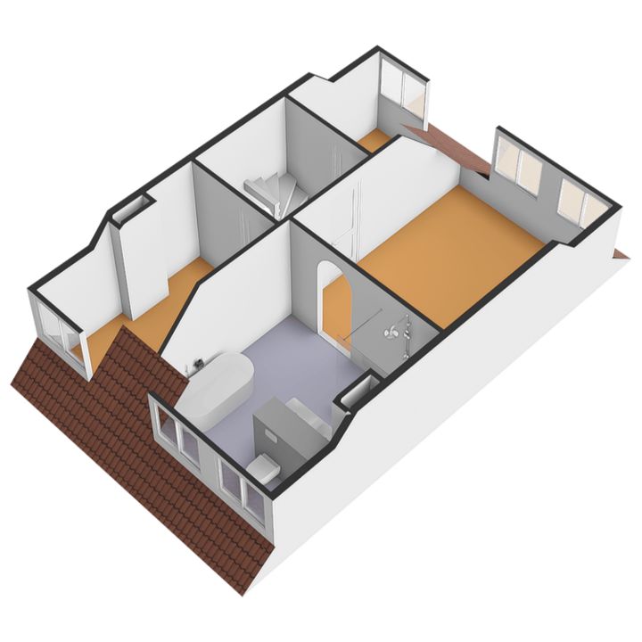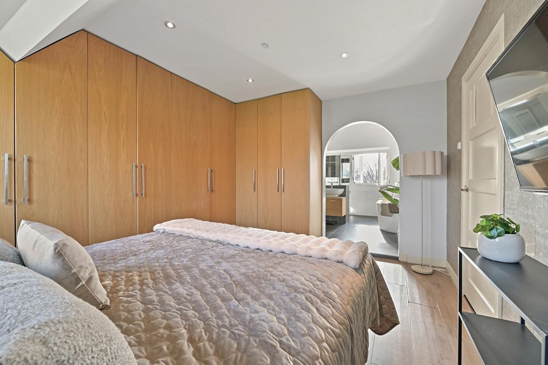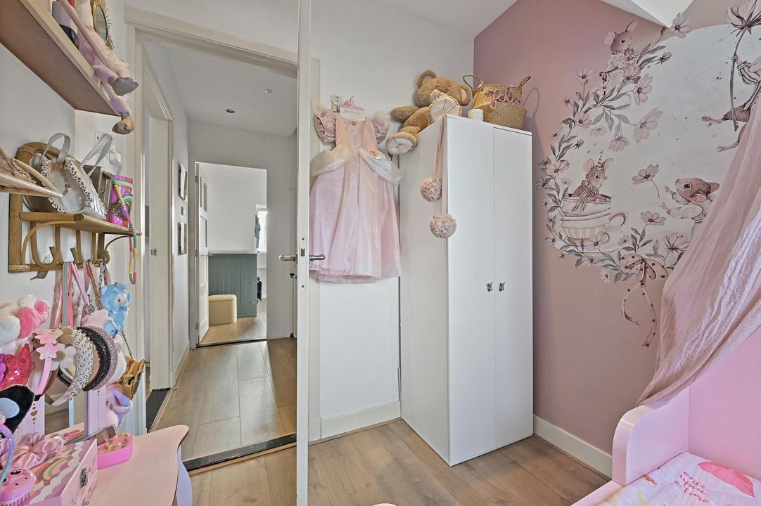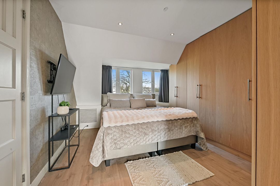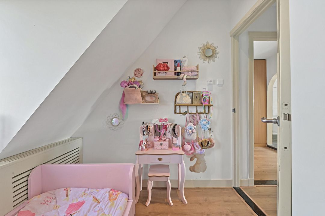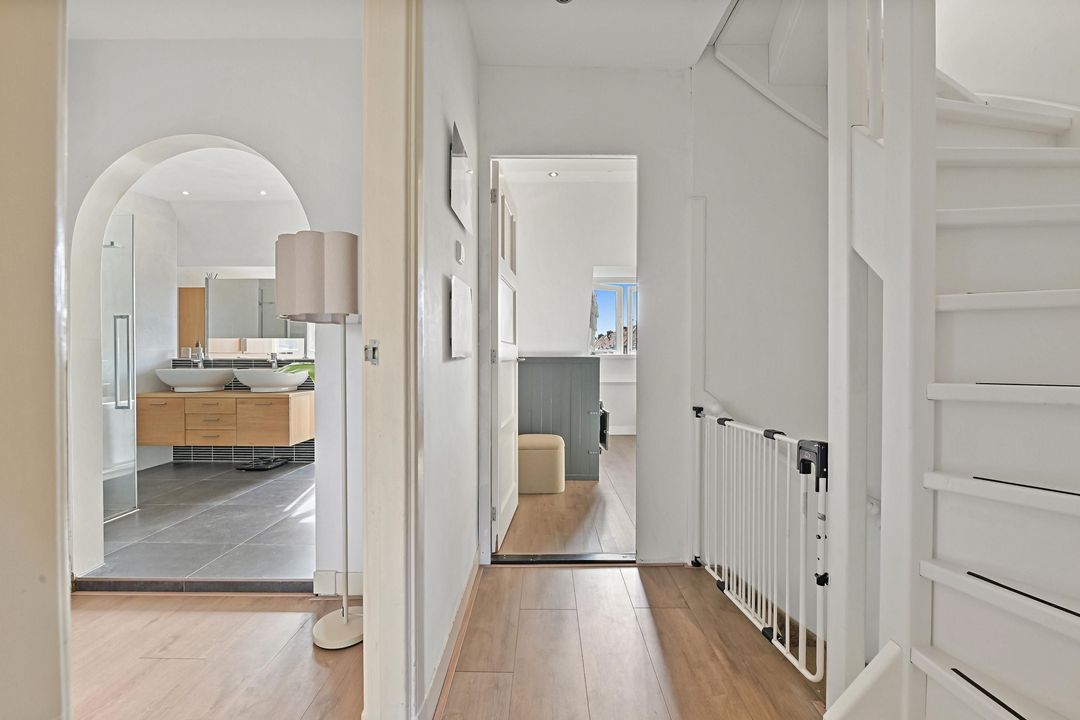 Overloop met toegang tot drie slaapkamers. Aan de voorzijde bevindt zich de eerste slaapkamer welke thans in gebruik is als kinderkamer. Aan de achterzijde bevindt zich de tweede slaapkamer, tevens in gebruik als kinderkamer. De master bedroom vind je aan de voorzijde en is van royaal formaat. De kamer is voorzien van fraaie maatwerkkasten en staat in directe verbinding met de luxe badkamer, hier ervaar je het echte hotelgevoel! De badkamer beschikt over een half vrijstaand ligbad, ruime inloopdouche, wastafelmeubel met dubbele waskom en wandcloset. Ook de badkamer is voorzien van maatwerkkasten, in hetzelfde design als de slaapkamer. Vaste trap vanuit de overloop naar de zolderverdieping.
