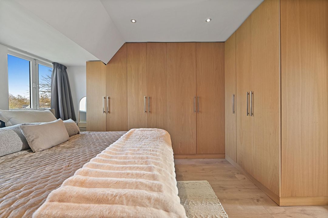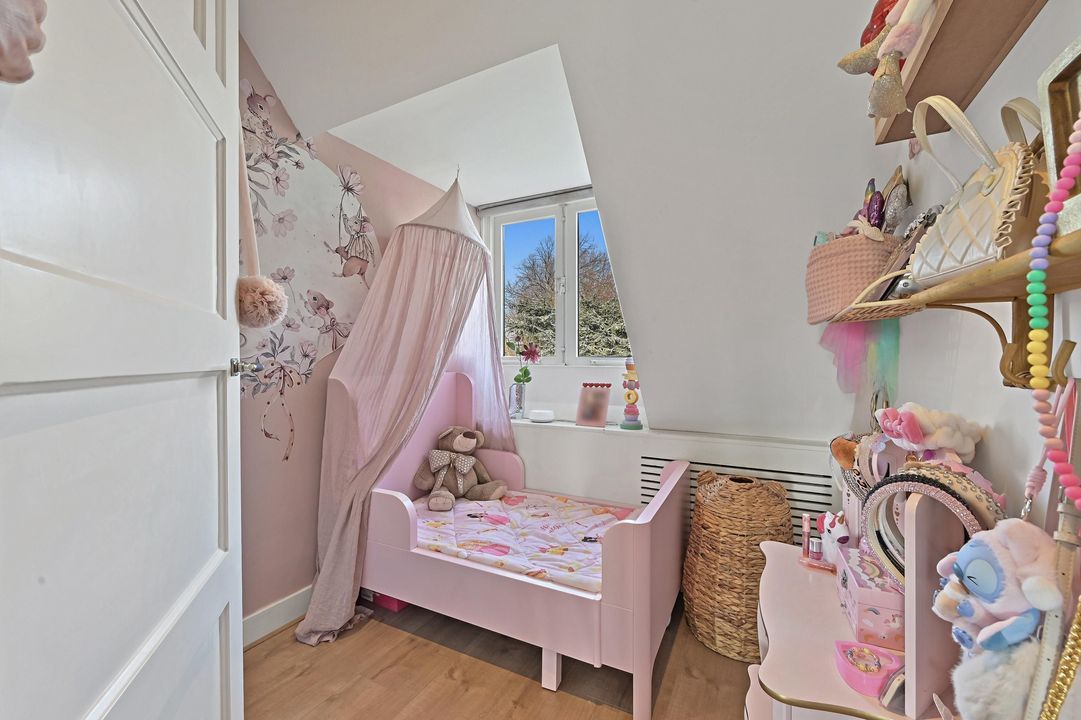 Landing with access to three bedrooms. At the front is the first bedroom, currently used as a child’s room. At the rear is the second bedroom, also used as a child’s room. The master bedroom is located at the front and is generously sized. It features custom-built wardrobes and connects directly to the luxurious bathroom, creating a real hotel-like feel.