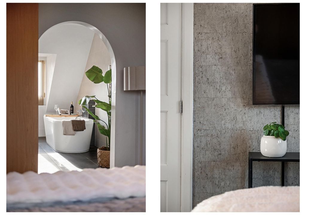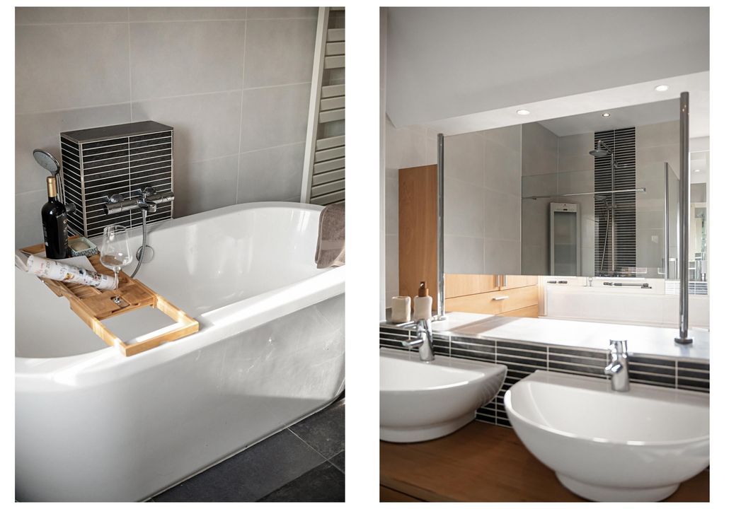 The bathroom includes a semi-freestanding bathtub, spacious walk-in shower, double vanity unit, and wall-mounted toilet. It also features custom cabinetry in the same style as the bedroom. Fixed staircase to the attic.
