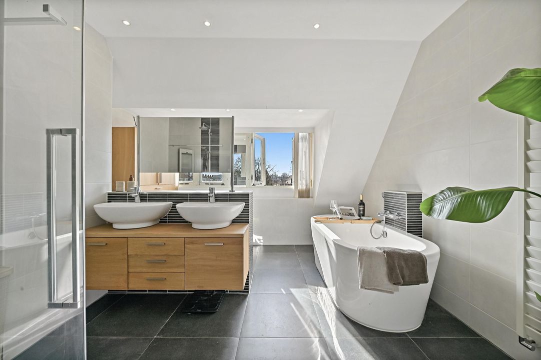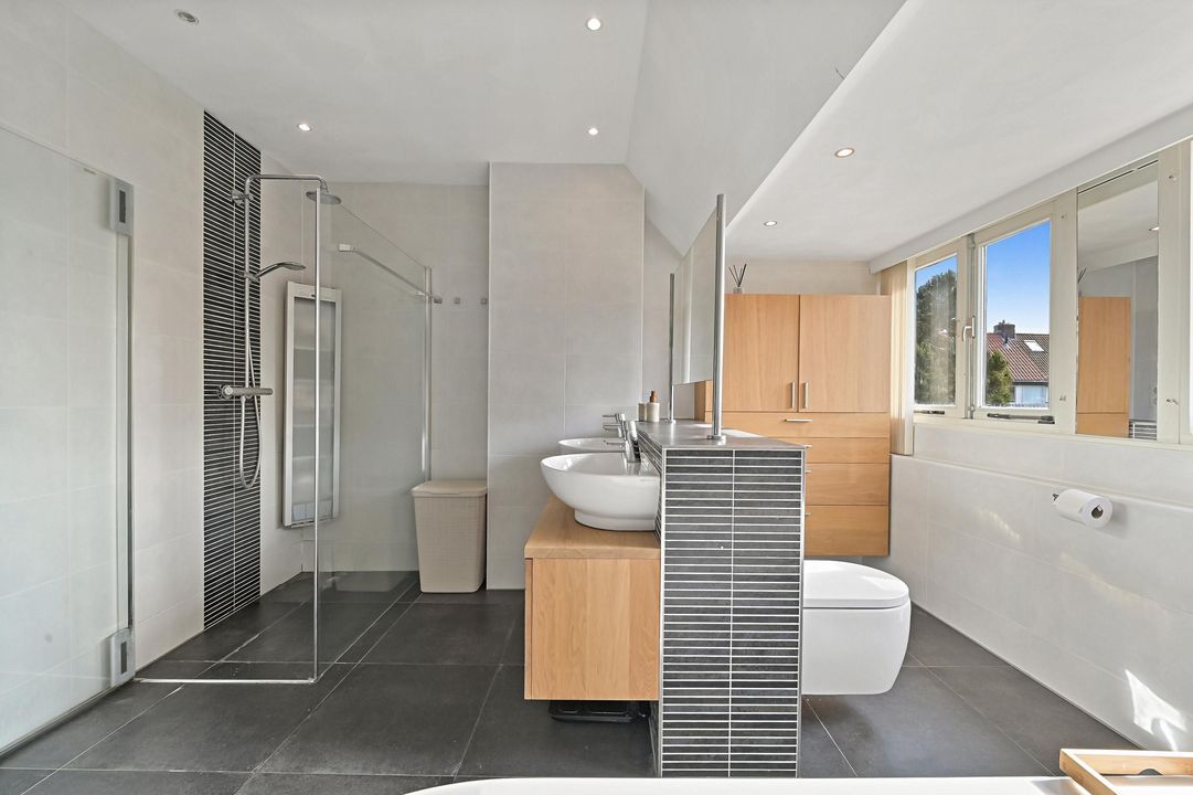 - Luxe en royale badkamer met half vrijstaand ligbad, ruime inloopdouche, wastafelmeubel met dubbele waskom, wandcloset en praktische kast